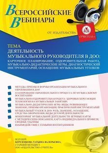 Вебинар Деятельность музыкального руководителя в ДОО: карточное планирование, оздоровительная работа, музыкально-дидактические игры, диагностический инструментарий, оснащение музыкальных уголков